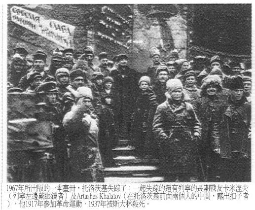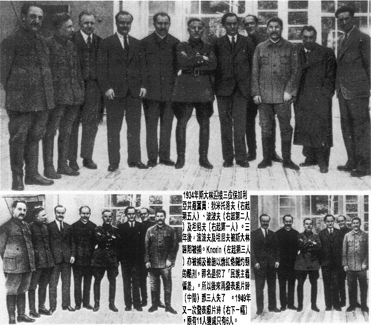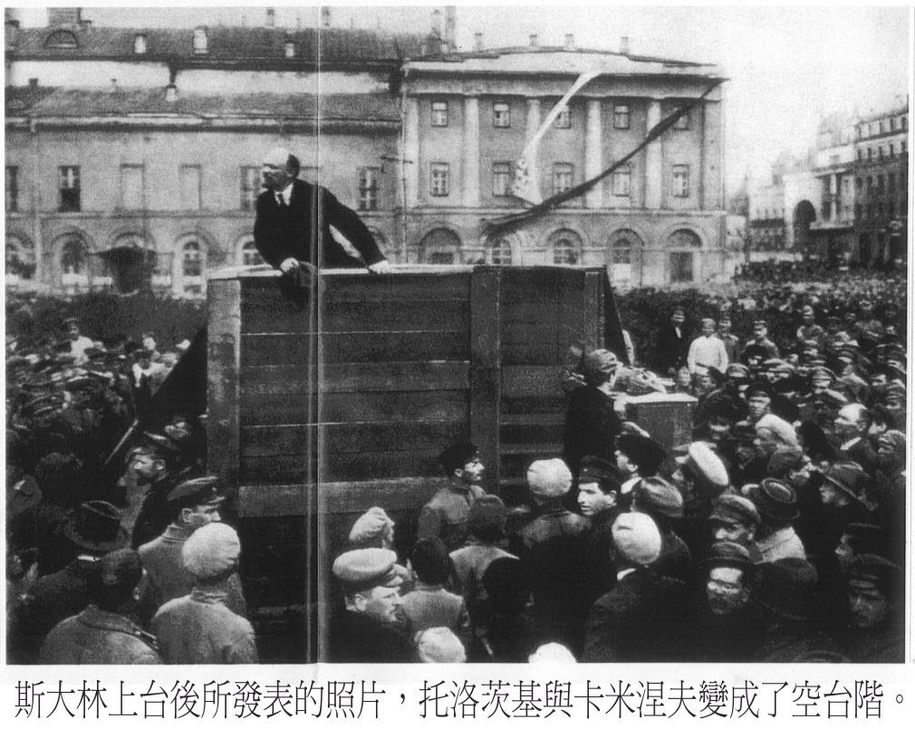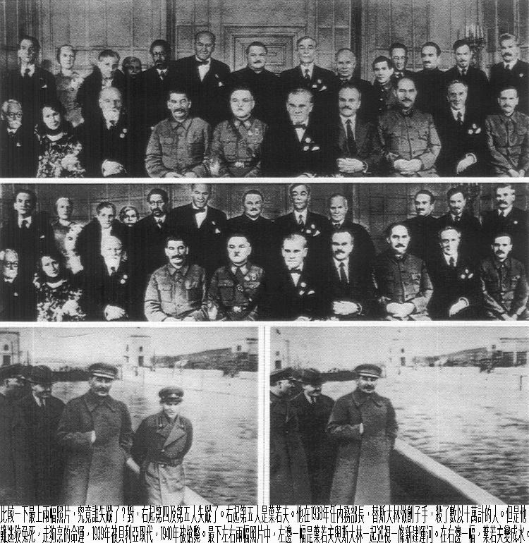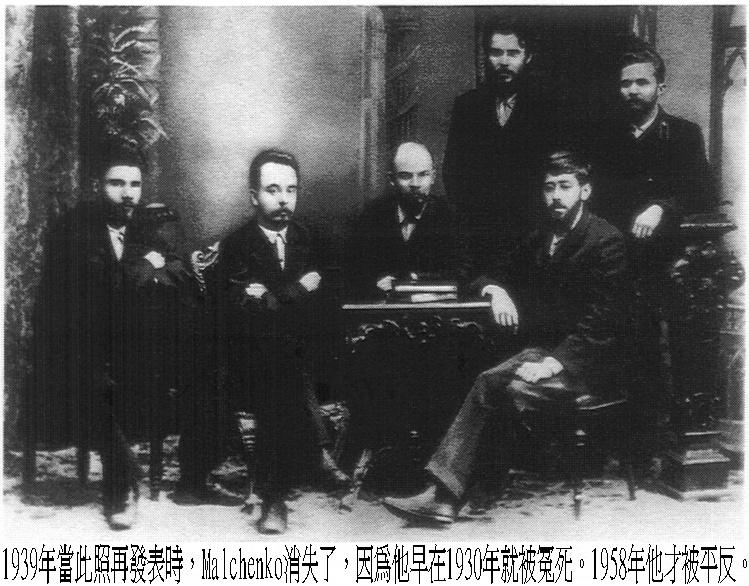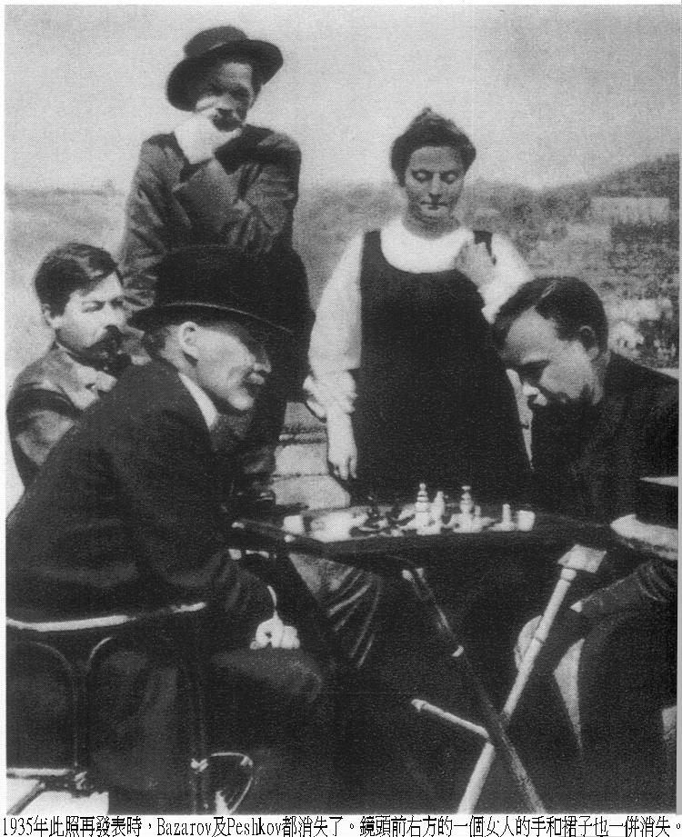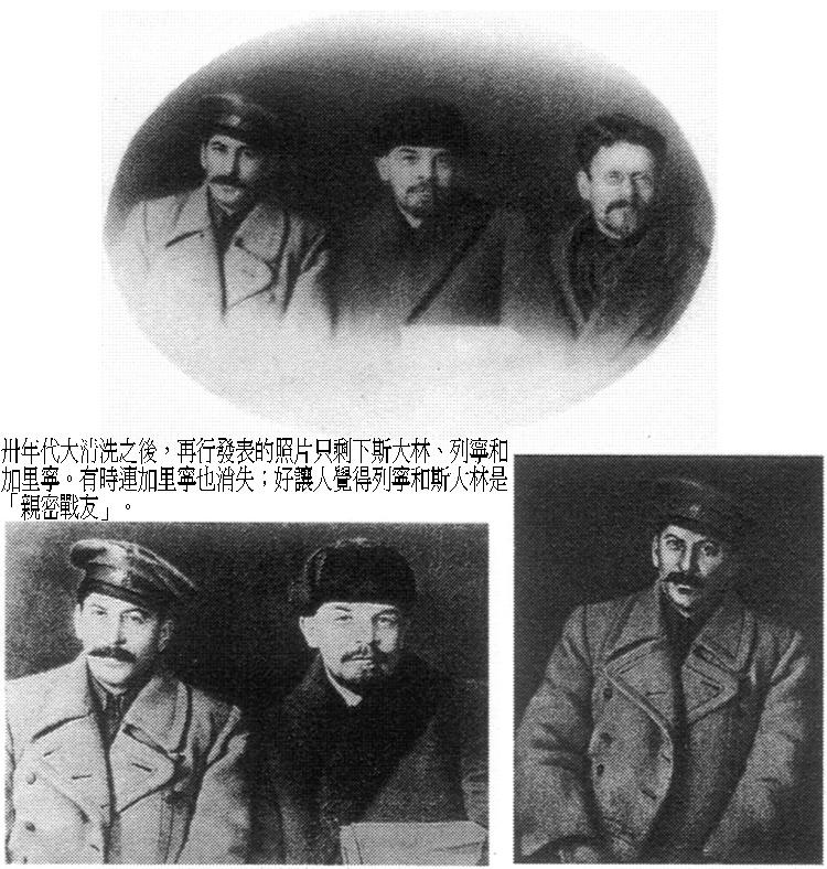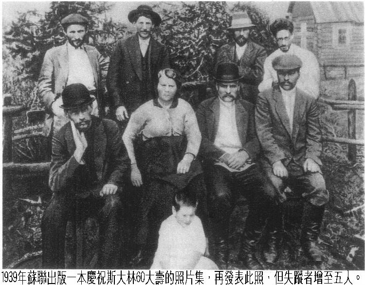 | 中文马克思主义文库 -> 图片馆 -> 【图库】斯大林伪造照相馆 斯大林伪造照相馆 历代的当权者为了巩固其政权,常常会用各种手段捏造及歪曲真实的历史,以达到愚民的效果,方便其统治。这种捏造历史的情况似乎在那些完全不受人民监督,拒绝任何方式的民主政治,却整天自称是代表人民的伪社会主义政权尤其严重。这里要介绍给读者的是一部难得的有关伪造前苏联历史的照片集,整个伪造过程的幕后黑手不是别人,正是在俄国1917年革命退潮中用尽一切阴谋手段去夺得统治权的独裁者史太林。在他掌权期间,不但进行大规模的清洗计划,把知情者及政治上的异己甚至自己的支持者一一从肉体上消灭,同时任意修改保存历史真相的珍贵图片及艺术品,为的是要消灭俄国十月革命的主要领袖(例如托洛茨基)的历史痕迹,同时伪造自己才是主要领袖的记录,为的是创造全国上下对他的个人崇拜。 幸好,历史最终不是按个人的意志行事的,更不容永远被歪曲。经过有心人的搜寻及研究,被埋没几十年的真相终于又再呈现在公众眼前。这本书叫《人民委员突然消失了》(The Commissar Vanishes),副题是史太林时代对照片及艺术的伪造,作者是英国图像历史学者David King。1997年版。 根据作者的介绍,资料的收集工作始于1970他的一次苏联之旅,当时他发现成千上万在史太林政权治下的受害者影像消失了,于是决定找出真相。之后他花了约三十年时间从各种各样的照片、书籍、海报以及印刷品中收集到廿五万份图像,并选出最精彩的部份收录在这图片集里。 读者会从这部精彩的著作中看到,史太林如何利用图片科学的技术来达到他个人的政治目的,把所有不利于巩固他个人权力的历史人物从照片中剔除。他命令官僚用无所不用其极的手段去窜改历史图像。其中包括把照片中的人物用喷漆涂污,删除图片中原有的人物,窜改群众场景等等。本书采用的封面就是其中一幅著名的照片:三名苏共高层干部在不同时期刊登的官方照片中陆续消失,最后只剩下史太林一人!类似的手法在其它地方出现过无数次。他尤其用心去捏造他在革命伊始已是列宁的亲密战友,以及消灭人们对革命第二号领袖人物托洛茨基 (史太林的宿敌,后被史派遣的格别乌杀害) 的记忆,照片中许多领袖人物在史太林手上最后只变成一堆干草,沼泽,耕地,梯级或干脆黑漆一片... 书中所用的部份图片是来自一位出色的前苏联艺术家的个人珍藏,其中有些人物──许多是被史太林认为是异己而遭清洗掉的──的面容都遭深色墨水涂污至难以辨认。