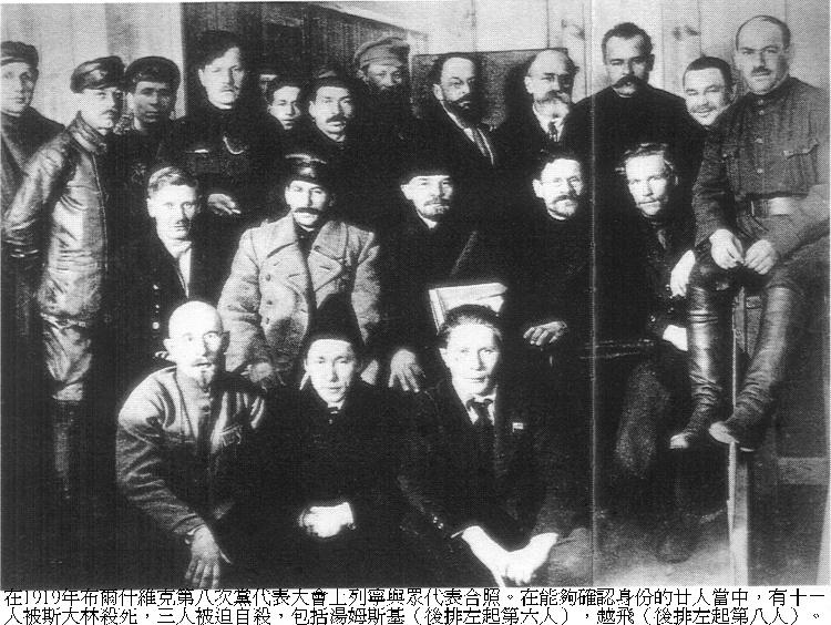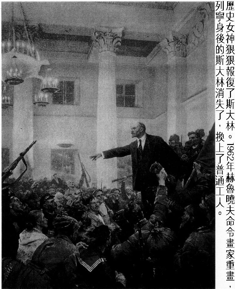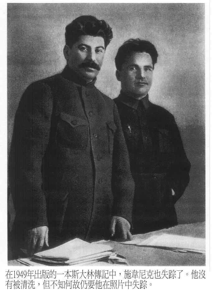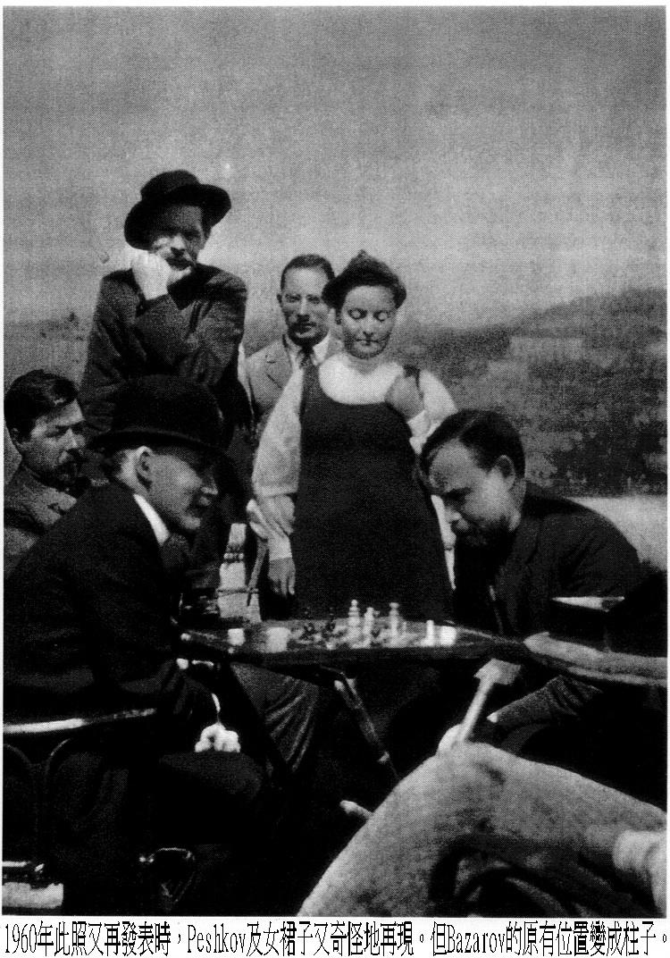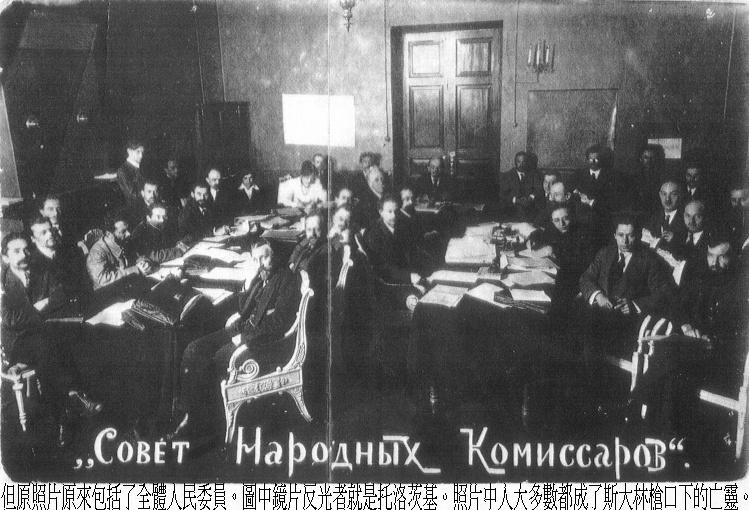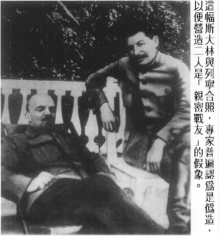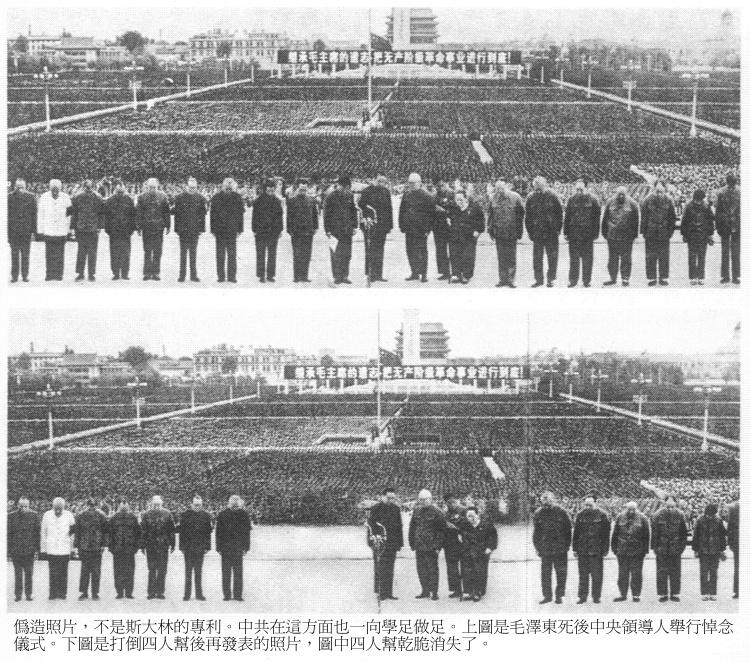 | 中文马克思主义文库 -> 图片馆 -> 【图库】斯大林伪造照相馆 斯大林伪造照相馆 历代的当权者为了巩固其政权,常常会用各种手段捏造及歪曲真实的历史,以达到愚民的效果,方便其统治。这种捏造历史的情况似乎在那些完全不受人民监督,拒绝任何方式的民主政治,却整天自称是代表人民的伪社会主义政权尤其严重。这里要介绍给读者的是一部难得的有关伪造前苏联历史的照片集,整个伪造过程的幕后黑手不是别人,正是在俄国1917年革命退潮中用尽一切阴谋手段去夺得统治权的独裁者史太林。在他掌权期间,不但进行大规模的清洗计划,把知情者及政治上的异己甚至自己的支持者一一从肉体上消灭,同时任意修改保存历史真相的珍贵图片及艺术品,为的是要消灭俄国十月革命的主要领袖(例如托洛茨基)的历史痕迹,同时伪造自己才是主要领袖的记录,为的是创造全国上下对他的个人崇拜。 幸好,历史最终不是按个人的意志行事的,更不容永远被歪曲。经过有心人的搜寻及研究,被埋没几十年的真相终于又再呈现在公众眼前。这本书叫《人民委员突然消失了》(The Commissar Vanishes),副题是史太林时代对照片及艺术的伪造,作者是英国图像历史学者David King。1997年版。 根据作者的介绍,资料的收集工作始于1970他的一次苏联之旅,当时他发现成千上万在史太林政权治下的受害者影像消失了,于是决定找出真相。之后他花了约三十年时间从各种各样的照片、书籍、海报以及印刷品中收集到廿五万份图像,并选出最精彩的部份收录在这图片集里。 读者会从这部精彩的著作中看到,史太林如何利用图片科学的技术来达到他个人的政治目的,把所有不利于巩固他个人权力的历史人物从照片中剔除。他命令官僚用无所不用其极的手段去窜改历史图像。其中包括把照片中的人物用喷漆涂污,删除图片中原有的人物,窜改群众场景等等。本书采用的封面就是其中一幅著名的照片:三名苏共高层干部在不同时期刊登的官方照片中陆续消失,最后只剩下史太林一人!类似的手法在其它地方出现过无数次。他尤其用心去捏造他在革命伊始已是列宁的亲密战友,以及消灭人们对革命第二号领袖人物托洛茨基 (史太林的宿敌,后被史派遣的格别乌杀害) 的记忆,照片中许多领袖人物在史太林手上最后只变成一堆干草,沼泽,耕地,梯级或干脆黑漆一片... 书中所用的部份图片是来自一位出色的前苏联艺术家的个人珍藏,其中有些人物──许多是被史太林认为是异己而遭清洗掉的──的面容都遭深色墨水涂污至难以辨认。