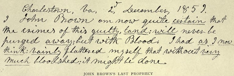 “我,约翰·布朗,现在坚信只有用鲜血才能洗清这个有罪的国土的罪恶。过去我自以为不需要流很多的血就可以做到这一点,现在我认为,这种想法是不现实的。