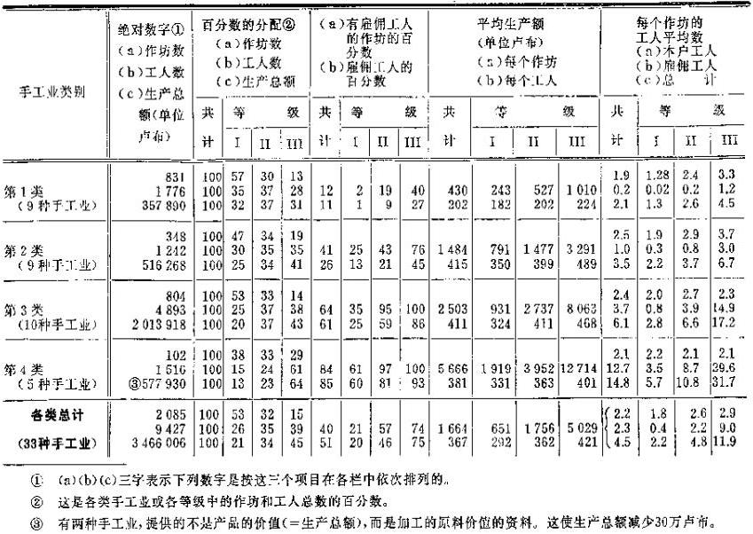 彼尔姆省的手工业调查也表明(根据8884个小手艺作坊和手工业作坊开设时间的资料),改革后时代的特点是小手工业发展得特别迅速。稍微仔细地看一看新手工业产生的这种过程是有意义的。弗拉基米尔省的毛织业和半丝织业是在不久以前即1861年产生的。最初,这种行业是外出做零工,以后才在乡村中出现分发线纱的“师傅”。最早的“厂主”之一一度做过麦米买卖,在坦波夫省和萨拉托夫省的“草原”采购麦米。随着铁路的修建,粮价拉平了,粮食生意集中在百万富翁手中,于是我们这位商人决定把自己的资本投入工业织布企业;他进了工厂,熟悉了业务,成了一位“师傅”。[注:《弗拉基米尔省手工业》第3编第242—243页。]由此可见,当地新“手工业”的形成,是由于国内总的经济发展把资本从商业中排挤出去,并把它引入工业。[注:米·伊·杜·-巴拉诺夫斯基在他关于俄国工厂历史命运的研究著作中指出,商业资本是大工业形成的必要的历史条件。见他的《俄国工厂今昔》一书,1898年圣彼得堡版。]我们引以为例的手工业的调查者指出,他记述的情况决不是个别的,因为靠外出做零工为生的农民“是各种手工业的先驱者,他们把自己的技术知识带回本村,带领一批新的劳动力外出,而且以手工业能使小工房主和师傅一本万利的故事来打动富裕农夫。那些把钱存放在钱罐里或做粮食买卖的富裕农夫,听信了这些故事,就经营起工业企业来了”(同上)。弗拉基米尔省亚历山德罗夫县的制鞋业和制毡业在某些地方是这样产生的:细平布小工房或小型分活站的业主们眼看手工织布业衰落下去,就开办了从事其他生产的作坊,他们有时为了熟悉业务和培训子女还雇用师傅。[注:《弗拉基米尔省手工业》第2编第25页和第270页。]当大工业把小资本从一种生产中排挤出去的时候,这种资本就流入其他生产,推动其他生产朝同一方向发展。 改革以后使小手工业在农村中得到发展的一般条件,已由莫斯科省手工业的调查人员作了非常清楚的说明。我们在对花边业的记述中看到:“一方面,这时的农民生活条件大大恶化,另一方面,一部分境况较好的居民的需要却有了显著的增长。”[注:《莫斯科省手工业》第6卷第2编第8页及以下各页。]接着作者根据他所列举地区的资料断言,在多马农民人数和农民牲畜总数增多的时候,无马的和不种地的农民人数也同时增多。这样一来,一方面是需要“外水”、寻找副业工作的人数增多了,另一方面是少数富裕户发了财,有了“积蓄”,有“可能雇用一两个工人或者把工作分配给贫苦农民在家里做”。作者解释说:“当然,我们在这里没有谈到从富裕户中发展起来的那些有名的所谓富农、土豪的情况,而只是考察了农民中最通常的现象。” 总之,地方调查人员指出了农民分化和农民小手工业发展之间的联系。这是完全可以理解的。从第2章叙述的资料中可以得出结论说,种地的农民的分化必然使农民小手工业同时发展起来。随着自然经济的衰落,各种原料加工一个个地变成单独的工业部门;农民资产阶级和农村无产阶级的形成,增加了对农民小手工业产品的需求,同时也为这些手工业提供了自由的劳动力和闲置的货币资金。[注:尼·—逊先生在论述“手工业资本主义化”时所犯的基本理论错误,是他忽略了商品生产和资本主义在其依次各阶段中的那些最初步骤。尼·—逊先生从“人民生产”直接跳到“资本主义”,而后又带着一副可笑的天真神情,惊奇地发现资本主义是没有基础的、人为的等等。] 四 小商品生产者的分化。莫斯科省手工业者的按户调查资料现在我们来考察一下,在工业小商品生产者中间形成的那些社会经济关系是怎样的。确定这些关系的性质这个任务同前面第2章中提出的研究小农的任务是一样的。现在我们应当依据的不是农业经营的规模,而是手工业经营的规模;应当把小手工业者按其生产规模加以分类,考察雇佣劳动在每一类中的作用、技术状况等等。[注:瓦尔泽尔先生在描述切尔尼戈夫省的“手工”工业时,肯定“经济单位是多种多样的”(一方面是收入达500—800卢布的农户,另一方面是“近于赤贫的”农户),并且作了这样的评论:“在这种条件下,对农户进行按户登记,并把它们及其全部经营设备划分成一定数量的平均农户,这是提供手工业者经济生活全貌的唯一办法。其余的一切,或者是偶然印象构成的幻想,或者是根据各种平均数字作出的不切实际的算术计算……”(《俄国手工工业调查委员会的报告》第5编第354页)]为了进行这种分析,必须有手工业者的按户调查资料,我们现在掌握的是莫斯科省手工业者的按户调查资料。[注:《莫斯科省统计资料汇编》第6卷和第7卷,《莫斯科省手工业》和安·伊萨耶夫《莫斯科省手工业》1876—1877年莫斯科版,共2卷。在《弗拉基米尔省手工业》中,也刊载了有关少数几种手工业的这样的资料。不言而喻,我们在本章只考察这样的手工业,在这些手工业中,小商品生产者为市场工作,而不是为包买主工作,至少在大多数情况下是如此。为包买主工作是一种更复杂的现象,我们在下面将专门考察这种现象。为包买主工作的手工业者的按户调查资料,对判断小商品生产者之间的关系并不适用。]调查人员对许多手工业都列举了有关每一个手工业者的生产、有时还包括其农业的确切统计资料(作坊建立
