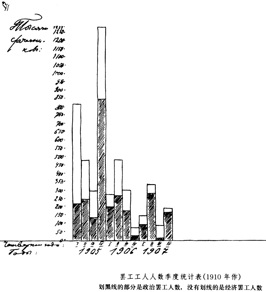在运动出现低潮的时候,经济罢工人数要比政治罢工人数下降得快。1906年,尤其是1907年的运动,其弱点无疑是缺少经济斗争的广泛可靠的基础。另一方面,政治罢工人数一般下降得较慢,尤其是1906—1907年下降得不多,这种情况看来是说明了一个我们所熟悉的现象:先进阶层以最大干劲来中止退却并且变退却为进攻。