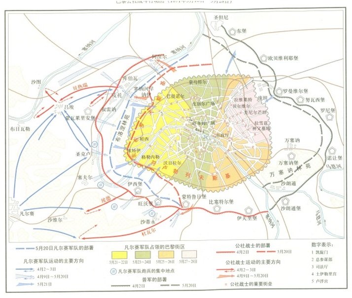 4月7日,凡尔赛军队在巴黎西线夺取了讷伊近旁的塞纳河渡口,但是,4月11日,他们向南线进攻时却被埃德将军击退,伤亡惨重。巴黎遭到不停的炮击,而下令开炮的恰恰是曾经指斥普军炮击巴黎为亵渎圣地的人。就是这些人现在乞求普鲁士政府急速遣返在色当和梅斯被俘的法国士兵,好为他们去夺回巴黎。由于这批兵员陆续开到,凡尔赛军队从5月初起就占了决定性的优势。这种情况在4月23日已经表现出来了,这一天,梯也尔停止了根据公社提议开始进行的谈判,谈判的内容是用作为人质关在巴黎的巴黎大主教[4]及其他许多神父来交换两度当选为公社委员、但被关在克莱尔沃的布朗基一人。而在梯也尔改变了的说话口气中,这种情况表现得更加明显,他先前说话是慎重而含糊的,现在忽然变得蛮横无礼咄咄逼人了。在南线,凡尔赛军队于5月3日占据了穆兰—萨凯多面堡,9日占据了已被炮火完全夷为平地的伊西堡,14日占据了旺沃堡。在西线,他们陆续攻占城墙外的许多村庄和建筑物,一直推进到主墙的脚下,5月21日,由于有人叛卖以及在那里驻防的国民自卫军疏忽大意,他们得以闯进城内。占据着北部和东部炮台的普鲁士军队,准许凡尔赛t军队取道城市北部按照停战协定条款禁止他们进入的地带向前推进,从而使他们能够在这样一条广阔的战线上实行进攻。巴黎人想必认为这一地带有停战协定作为保障,因而防守不力。正因为如此,巴黎西半部即真正的富人区只进行了微弱的抵抗;闯入的敌军越接近东半部即真正的工人区,所遇到的抵抗就越激烈越顽强。只是在经过八天的战斗之后,最后一批公社捍卫者才在贝尔维尔和美尼尔芒坦的高地上倒下去,这时对赤手空拳的男女老幼已进行了一个星期的越来越疯狂的屠杀达到了顶点。用后装枪杀人已嫌不够快了,于是便用机关枪去成百上千地屠杀战败者。最后一次大屠杀是在拉雪兹神父墓地上的一堵墙近旁发生的,这堵“公社战士墙”至今还伫立在那里,作为无声的雄辩见证,说明一旦无产阶级敢于起来捍卫自己的权利,统治阶级的疯狂暴戾能达到何种程度。后来,当发觉不可能把一切人杀尽的时候,就开始了大逮捕,并从俘虏群中任意拉出一些牺牲品来枪杀,其余的人则赶到大营房里去,让他们在那里等待军事法庭的审判。包围着巴黎东北部的普鲁士军队奉命不得让一个逃亡者通过,但是军官看见士兵对人道比对上司命令更加肌人时,往往装做没看见。特别的荣誉应该归于萨克森军,它非常人道,放走了许多分明是公社战士的人。