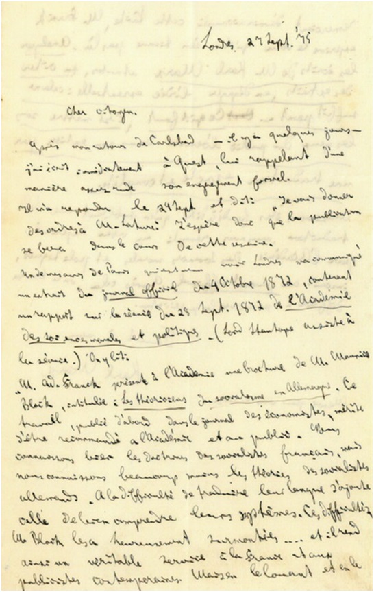 我的一位在巴黎的友人访问伦敦,给我带来一份1872年10月4日的《公报》[2]摘要,上面有关于1872年9月28日伦理与政治科学院举行的会议的报告(斯坦霍普勋爵出席了会议)。上面写道: