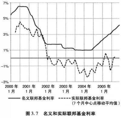 当然,美联储在衰退期间经常采取调低短期利率的行动。但在2000年代早期,货币宽松政策似乎比以往要宽松得多。哲斯塔和史密斯(Gjerstad and Smith,2009:271)把它描述为“异乎寻常的扩张性政策”,约翰·泰勒(John Taylor)认为,“实际利率的决策远远低于根据历史经验制订的政策所应该执行的水平”。2001年以后,美联储的行动“偏离了政策实施的常规方式,这样做的目的是为了应对……类似于1990年代日本所发生的对通货紧缩的恐慌……”(Taylor,2009:342—343)。