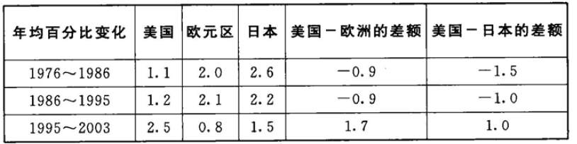 20世纪90年代,欧洲的经济增长缓慢。1995年开始,生产率急剧下滑,和已经恢复的美国相比,欧洲的这种变化是惊人的(见表6.1)。