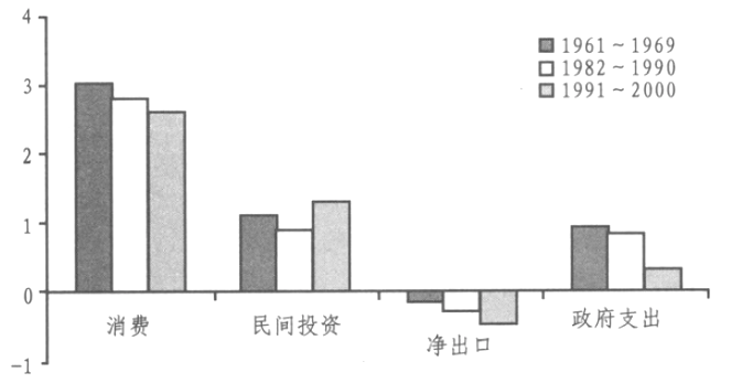 尽管消费的增长并不显著,但它在20世纪90年代的增长中所占的份额较以往有所提高(20世纪90年代为70%,20世纪60年代为60%)。正如在第四章提到的,美国的收支平衡急剧恶化,体现在图中净出口的下降,极大拖累了美国经济的增长速度,但却刺激了世界上其他国家经济的发展。民间投资,尤其是商业投资,在20世纪90年代对美国经济增长的贡献增加,尽管当时人们担心企业会迫于金融市场的压力而拿出大量的现金用来支付红利和回购股票,这样会导致企业投资资金的紧张[1]