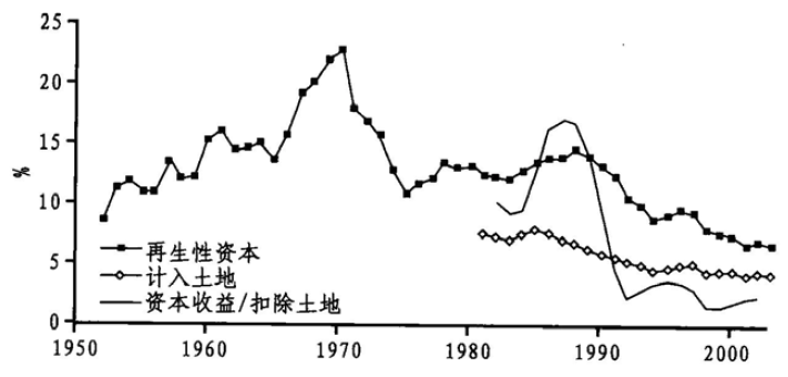 到了第三阶段,利润率的计算则涉及土地资源的得与失。在20世纪80年代后半期,随着土地价格的疯涨,生产性投资回报率及土地的总体利润率都明显上升。在高峰时期,对于非金融企业来说,土地升值带来的收益要远高于常规商业行为带来的收益。这种情况无疑鼓励了额外投资的介入,特别是介入土地占重要地位的工程中,这样,投机资本的获利机会明显增多。当泡沫破碎时,资本损失取代了盈利,并且总体投资回报率狂跌2%~3%。尽管名义利率很低,但是总体物价的下降意味着实际利率的表现实质上是积极的。从新投资可能得到的回报上来说,下降的地价是一个抑制增长的显著因素,因为它使资本在未来呈现出下降的趋势。从金融角度来看,地价的下降意味着其抵押贷款能力的降低,这使企业更不愿意贷款。如此说来,金融业的兴衰对经济的持续停滞不前有着重要的影响。一旦金融业陷入危机,企业赢利能力的低增长率反而会进行自我恢复,因为很多日本国内的企业在如此的投资回报率下不会进行投资,这便减小了企业的竞争压力。