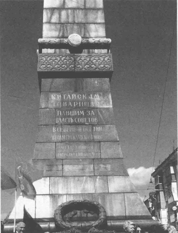 为纪念在苏俄国内革命战争时期(1918年弗拉季高加索8月事件)在弗拉季高加索牺牲的450余名中国国际主义战士,于1960年建立了该纪念碑。碑高20多米,由方形底座和细长石柱组成,前后两面碑文分别用俄文和奥塞梯文写就,汉语译为“献给国内战争时期在北奥塞梯为捍卫苏维埃政权而牺牲的中国同志北奥塞梯苏维埃社会主义共和国劳动大众谨立”。纪念碑位于波扎尔斯基和伊里斯通两条大街交叉地带的“革命广场”上,民众称该广场为“中国广场”。