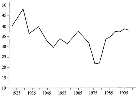 图1.2:1970年代的财产滑坡:美国收入最高的1%人口所持资产份额,1922—1998