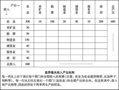 在这里,插入一个主流经济学后来对马克思的图式的基本思想进行发展的例子是很有用的。我这样做不仅仅是为了表明再生产图式后来具有的重要性,也为这个图式是关于什么的给出一个更清晰的概念,并阐明其实际应用的可能性。在20世纪30年代末期,瓦西里·里昂惕夫是一名俄国经济学家,在20世纪30年代先是去了德国,后来又到了美国。他为了创立后来广为人知的“投入产出分析”,详细研究了马克思的模型。图6举出了一个典型的里昂惕夫矩阵,垂直一列是不同产业(投入要流向的产业)的投入数据,而水平一行是那些产业(产出要流向的)的产出数据。使用这样一个投入—产出矩阵,对于一个给定的产业(例如钢铁业),可以估计提高产出水平需要多少额外的投入(例如煤炭、能源和铁矿石),还能反复地追溯增加煤炭生产所需的额外投入(例如,额外的机器和这些机器所需的额外的钢铁)。里昂惕夫靠投入产出分析而获得了1974年诺贝尔经济学奖,它在战后繁荣的和平年代作为发达资本主义国家的一种计划工具得到了广泛利用,直到今天在国民经济核算中仍具有重要地位。这个技术也被吸收到通常由共产主义政权设计的五年和十年计划中去了,也被许多民主的准资本主义国家所使用,例如独立后的印度。简而言之,它成为中央计划的一个重要工具。