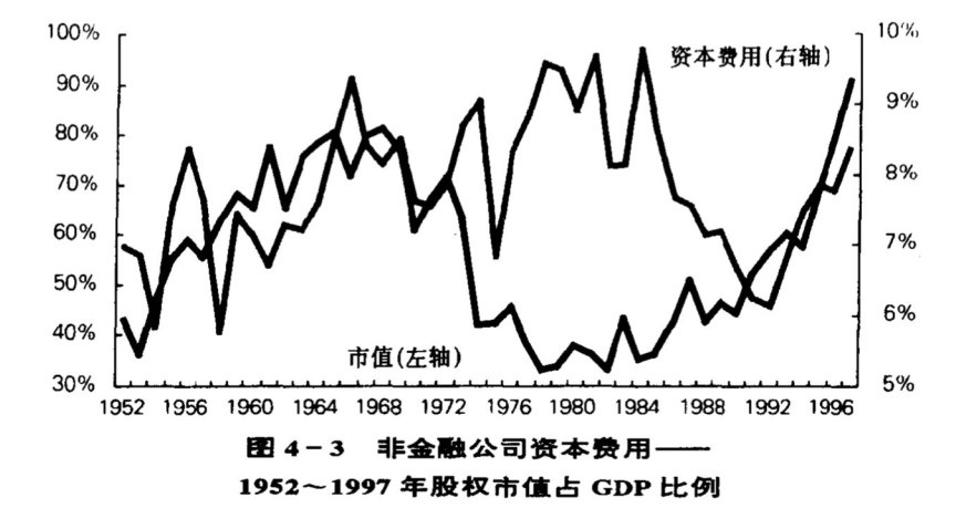图4-3 非金融公司资本费用——1952~1997年股权市值占GDP比例