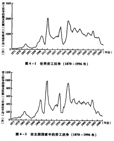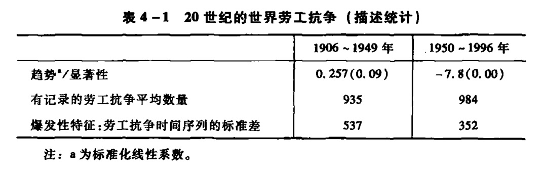 20世纪上半期存在于战争和劳工抗争之间的恶性循环,与20世纪下半期的世界劳工抗争发展轨迹形成了鲜明对比。在20世纪上半期,世界劳工抗争呈不断上升趋势并具有爆发性的特征;而在20世纪下半期,世界劳工抗争不仅呈下降趋势且远没有那种爆发性的特征。这一鲜明对比的模式,可以在图4-1和图4-2(不过,显然图4-3并不遵循这一模式)以及表4-1所提供的概括性描述统计中清楚看出。在这两个时期,每年劳工抗争数量的均值水平大致相同:其劳工抗争数量的年平均记录,分别是935件和984件。但是,20世纪上半叶期间劳工抗争的上升趋势,和20世纪下半叶的世界劳工抗争的下降趋势,形成了鲜明对比。此外,尽管劳工抗争在20世纪上半叶表现出很强的爆发性特征(用均值的标准差来进行测量),但到了20世纪下半叶期间劳工抗争就很少表现出这种爆发性的特点。