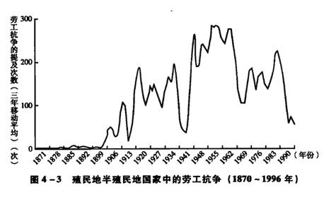 这一世界大战和劳工抗争的时间模式之间的相互关联在宗主国表现得最为明显(参见图4-2)。而且,即使在整个殖民地/半殖民地国家,这种关联也是显而易见的:在两次世界大战前夕劳工抗争都在增加,并且在战争刚开始的时候公开的劳工抗争有短暂而大规模的减少,而在战争结束后又有重大的劳工抗争浪潮兴起(参见图4-3)。在劳工抗争的宗主国模式和殖民地/半殖民地模式之间,最为明显的区别在于世界大战之后的两次劳工抗争浪潮的相对规模不同。对宗主国而言,第一次世界大战结束后的劳工抗争浪潮的规模要大于(但持续时间并不长于)第二次世界大战后的劳工抗争,但是,对整个的殖民地/半殖民地地区而言,情况刚好相反,其二战之后的劳工抗争规模比一战后的规模更大,且持续时间更长。[4]