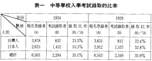 一九二二年开始,整个教育制度获得统一。从中等教育起,推行□□「共学制」[27],这种措施实际上只是方便日本人的作法而已。中等学校的入学考试确实是对日本人的小学校和台湾人的公学校孩童开放,但是考试内容却是以小学校的教材为依据,对于在初等教育素质上已经受到歧视的台湾人而言,这种考试的结果很明显地并不公平。下表很清楚地表明了这□事实状况: