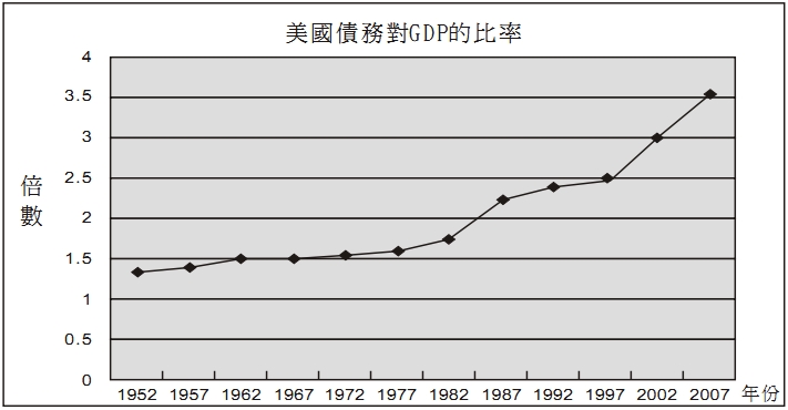 负债消费是新自由主义年代的美国经济一大特色。上图显示,战后美国的负债一直维持于1.5倍本地生产总值的水平,可是自上世纪80年代初以降,便一直攀升,于近几年更突破了3.5倍的水平。