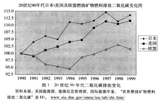 20世纪90年代日本\美国及欧盟燃烧矿物燃料排放二氧化碳变化图