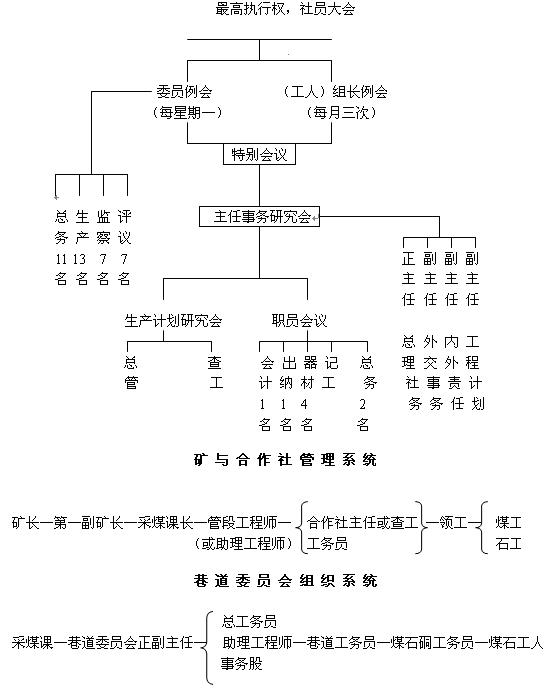 | 中文马克思主义文库 -> 参考图书·阶级斗争文献 -> 开滦煤矿55年(1948年~2003年) 解放初期采掘组织建制 默耕 《开滦史鉴》1996 第1期 总第11期 工人自包生产合作社,是唐山解放初期开滦井下采掘生产的一种组织形式,并由此过渡形成至今的采掘区的建制。这种煤矿生产基层组织的出现距现在已有47年了。它的存在虽然不足两年的时间,但它取代了开滦有史以来70多年的封建组织——包工大柜,对维持当时经济非常困难的开滦煤矿生产起到了积极的作用,在开滦发展史上写下了重要的一页。 一、工人自包生产合作社的建立开滦煤矿自创办到唐山解放,在井下采掘生产上,一直沿用包工大柜制。包工大柜与矿订立合同,组织一定的工人劳动力,承做一定的采掘工程。几十年来,它已成为矿方控制工人的组成部分和被矿方利用统治工人的一种工具。这些包工大柜的东家大多是流氓土绅,他们与反动党团、特务相勾结,并眷养了一批打手,用以维护他们的统治。在这种封建包工大柜组织下,广大矿工深受血腥统治和双重剥削。因此,唐山解放后,广大矿工纷纷要求取消包工大柜,一些职工还提出了书面意见。 驻开滦中国人民解放军军代表和工会筹委会,坚决支持职工群众的要求,为慎重处理好这个问题,于1949年4月中旬邀请了14位井下工人,组成包工问题研究会,前后经过一个多月的时间,宣传酝酿,了解情况,调查研究,确定取消包工大柜,用工人自包生产合作社代替,原矿方给包工大柜的好处,同样给予工人自包生产合作社,对于包工大柜东家除罪大恶极外只要不做破坏活动,决心回到工人阶级自己队伍里来者,一概留用。5月16日(18日)首先在唐山矿召开职工代表会,明确提出取消潘绍棠包工大柜。在原包工问题研究会的基础上,又正式选举了17人为领导这项工作的行动委员会,责令包工大柜结账移交,讨论取消包工大柜后组织形式、人选及条件,宣传揭露包工大柜某东家罪行,广大职工欢欣鼓舞。6月22日选举了9名社务委员,在矿区正式成立了第一个工人自包生产合作社,其正副经理由工人自选的社务委员担任,使原来的包工大柜这个庙“换了神”,其他职工、查工、二头大体不动。 各矿以唐山矿第一个工人自包生产合作社为典型引路,先后成立了取消包工大柜的筹委会,在1949年7、8月普遍展开了取消包工大柜建立工人自包生产合作社的运动。7月1日,赵各庄矿工人接管了两个包工大柜,林西矿工人接管了原包工大柜。7月14日,唐家庄矿工人接管了四义包工大柜。8月8日,唐山矿井下取消了包工大柜,除井口运输外,组成了6个工人自包生产合作社。到8月底,全矿区取消了57个包工大柜,相应建立了工人自包生产合作社。9月份,开滦矿区第一届工人代表大会作出取消包工大柜的决议。到1950年2月,开滦矿区井上下包工大柜全部取消,包括3万数千名职工全部改为工人自包生产合作社。 二、工人自包生产合作社的体制工人自包生产合作社,它仍是一个包工制,是在性质上起了根本变化的工人自包制。工人自包制的生产合作社,是工人大家做主人(东家),大家选举负责人,它的最高权力机构是社员大会或社员代表会,工人由被包工大柜奴役的地位变为合作社的主人。工人在合作社的经济利益也得到改变,工人应得工资、奖金、分红等能及时全部得到,不再受包工大柜克扣剥削。合作社同矿方关系也不同过去了,包工大柜与矿方资本家,在统治榨取工人多赚钱上是一致的,但也有矛盾,如包工大柜假报工程、虚报产量进尺、多报工吃黑工、背着矿方去“偷挖煤炭”,既破坏了矿方开采计划,浪费资金,又使工人遭受危险甚至伤亡。而工人自包生产合作社就不是这样了,在共同发展生产上,它是贯彻劳资两利政策的自觉执行者,生产搞好了双方都有利,所以双方协调多了。正由于以上种种关系的变化,使广大职工群众对矿山建设的责任心加强了,维持开滦生产、发展开滦生产的积极性提高了。 工人自包生产合作社,开始工作范围比较小,各矿皆有10个左右,管理分散。后来,逐步地按巷道合并,大体上一个巷道一个合作社。包括采煤、掘进、开拓及运输作业。一切计划、领导、效率管理都统一进行。党、政、工会的工作组织配合灵活一致。在合作社建立工会支会,党成立支部或总支,行政上煤师也负责一个巷道或一定区域的责任。经过调查,全局四个煤矿(马家沟矿还没有恢复)共组成了12个合作社,即赵各庄矿、林西矿各为3个,唐家庄矿2个,唐山矿4个。 工人自包生产合作社的组织管理形式,总的是社员大会或社员代表会是最高权力机构,但也不尽一致。如林西矿工人自包生产合作社规定,其最高机构为工人组长会议,即有工人代表会的意义,其次为社务委员会,最高执行权是社员大会,由社务委员会推选出合作社主任、副主任,掌握总理井上下一切社务,还有几个管理委员会;监察委员会——负责稽查帐目等,总务委员会——负责掌管财务,生产委员会——负责安全生产,评议委员会——负责评议职工成绩;具体业务有总务股、会计股、出纳股、工务股分工处理。还制定了社务规章制订的程序、社务各种会议制度、各项管理委员职责、款项动用手续等制度。 工人自包生产合作社与矿方的经营管理关系相对应。矿方井下(井工处)最高行政人员是井下管理,各巷段行政人员为管段监工或煤师;合作社方面负责行政者除主任(经理
