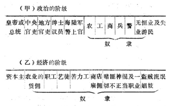 奴隶之定义如此,其苦其贱,固可知矣。为其苦也,谁肯为之?为其贱也,谁肯居之?故随指一人而谓之曰:“汝奴隶也。”其人必以为极羞辱侮慢,而大怒说者之无礼。盖奴隶乃人类中之至贱者,大皆有羞恶之心,其不甘居此名而大怒,宜也。然怒者苟平心以思则已,虽不愿居奴隶之名,却已有奴隶之实。今人类号称十五万万,其合于上述定义而确处奴隶生活中者,殆占十四万万有余也。不信予言,请尽吾说。试为图以明之: