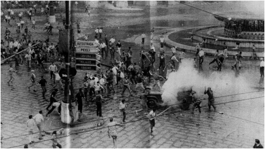 十名工人在街头游行中被谋杀,“意大利社会运动”[13]的代表大会推迟,各个城市的示威激增,法西斯支持的坦布罗尼政府垮台[14],更左的范法尼[15]的基督教民主党政府取而代之。这就是意大利六七月里的故事……
