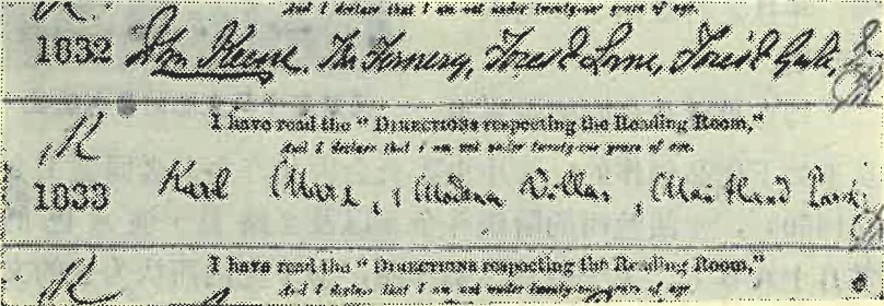 卡尔·马克思于1874年3月16日在阅览室登记本上的签字