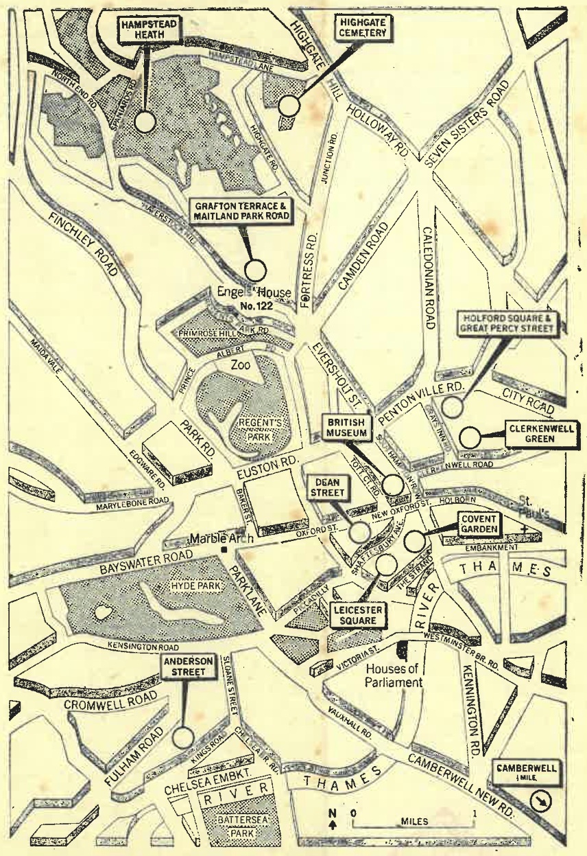目前在列宁住过的大帕西街(见103页地图)列宁立了一块纪念牌,列宁是在1905年为了参加俄国社会民主工党第三次代表大会到了伦敦,住在那里,这个地方现位于苏格兰皇家旅馆后面。1907年,列宁又到伦敦参加第五次代表大会,这次会议在伊斯林顿南门路兄弟会教堂召开,现在这个教堂已被拆除,在原地盖起了一个工厂。至于俄国社会民主工党的第二次和第三次代表大会的会址,至今还没有人知道在什么地方。列宁还曾在1908年和1911年两次到伦敦作短期的逗留,后一次住在奥克莱广场6号(NW1),离摩宁顿月牙路不远。列宁还去过不列颠博物馆和“共产主义俱乐部”(它的前身是“德意志工人教育协会”),这个俱乐部设在夏绿蒂街107号,1918年遭警察搜捕后关闭。