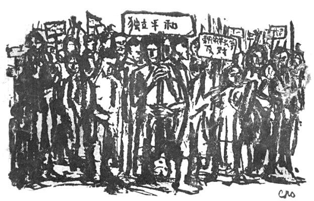 在东京的涩谷站,新宿站等处,停止了郊区的交通。这些地方有的是纠察队和标语,车站房屋上贴着许许多多标语。你好像听得到,今天罢工的几十万铁道员工的声音,多么响亮而庄严地在喊着:“我们要求和平,要求日本独立,要求合乎人道的生活条件……”