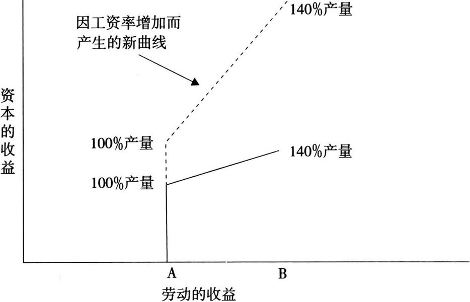 车间里经济斗争的目标是对工作表现的讨价还价,也就是说,劳动消耗的经济报酬或业绩的奖励。资方通过计件工资制来决定劳力的报酬。因此,1945年时,每一件产品都被赋予了“价格”。每小时的工资由生产出来的件数乘以每件的价格而计算出来。此外,当工人们未能生产出预期的数目时还有基本时薪保证。1975年时,工资制从基于价格转变到了基于“速率”,也就是说,对于给定产品而言,每一项作业都有规定的标准速率,它指出每小时要生产多少件。如果操作工超过了这个标准,他或她就能得到一笔根据各自每小时基本收入的比例计算出的奖金。当他们未能达到标准速率时,则获得基本收入。(关于“价格”、“速率”的进一步讨论参见第四章。)然而,在这两种机制中我们都可以建立一个“业绩 - 报酬曲线图”(见图 1),它显示出操作工因每小时生产出的产品数量而获得的报酬,即根据特定的业绩水准而获得的报酬。对任何一项操作而言,我们也能建立一个“业绩曲线图”,它显示了根据业绩水准而得出的资本与劳动(根据件数或相当的价值来衡量)的回报(见图 2)。业绩曲线的上升相当于超额。