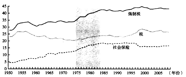 福利国家的发展程度可以用强制税负担率——即税赋和社会保障费用的总额与国内生产总值之间的比率——来衡量。在20 世纪70年代中期的经济衰退之前,人们对它充满了溢美之词:从经济角度看,它通过经济稳定器的作用——这一点人们在当前的危机中也可以看到——缓冲了经济衰退。各类福利资金的发放以及公共开支防止了经济衰退阶段需求的急剧下滑。它们还赋予了资本主义一定的社会合法性。但是这其中也有一个需要付出的代价,即社会保障费用的增长会快于国内生产总值的增长,但它在很大程度会被税收的下降所抵消——税收总是与国内生产总值保持一定的比例(见图9-3)。1974 -1975年的衰退打破了这种脆弱的平衡,并导致税收负担急剧增加:社会福利负担继续加重,而税收的增速也快于国内生产总值的增长速度。正是在这个时候吉斯卡尔·德斯坦说出了这句精辟的名言:“强制税超过40% ,这是社会主义。”