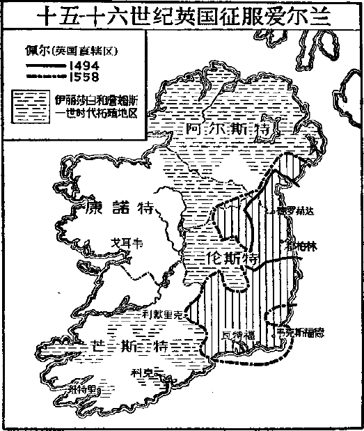 这个政策得到相当的成功,但它进行迟缓,并且使英国统治阶级没有剥削爱尔兰农民以得益的机会。到十六世纪中叶,政府放弃了这种政策而采取一种较为急剧的直接没收政策,把爱尔兰的土地强制出卖给英国的投机家,有时在爱尔兰设立英国移民的殖民地或种植园。五十年几乎不断的残酷战争,加上饥馑和屠杀,又继之以没收,使爱尔兰的大片土地变成荒凉的旷野。在伊丽莎白时代,用于对外战争的款项共计将近五百万镑,而用于爱尔兰战争的几占其中的一半。在一些混乱的小冲突中,沙恩·奥尼尔(1559-1567)、狄士蒙(1579-1583)和休·奥尼尔(1598-1603)所领导的起义最为显著。