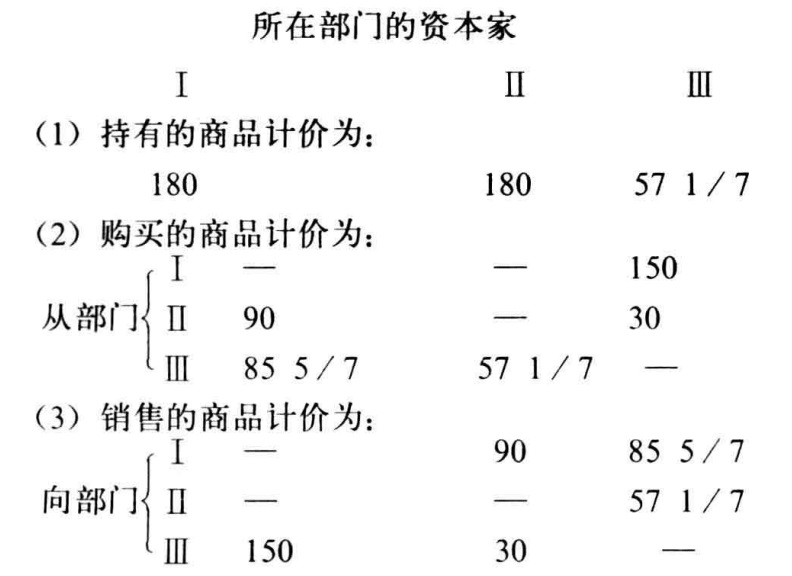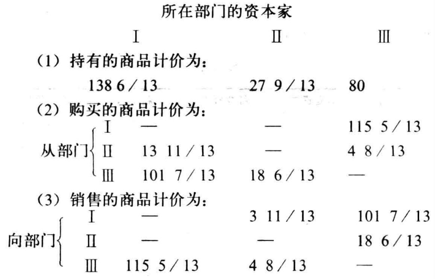在这里,部门Ⅰ和部门Ⅲ的资本家收进的比付出的少,而相反地,部门Ⅱ的资本家收入的相当于付出的二倍多。