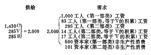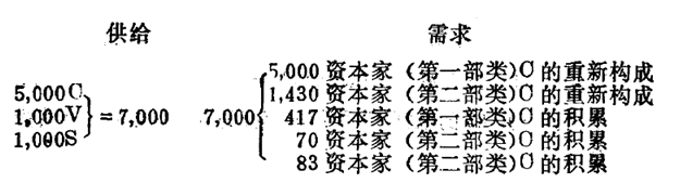 由此可见,周期开始时是7,715资本价值,到周期结束时已是8,399。下面我们用比较每个部类的供给和需求来结束这个表述。[1]